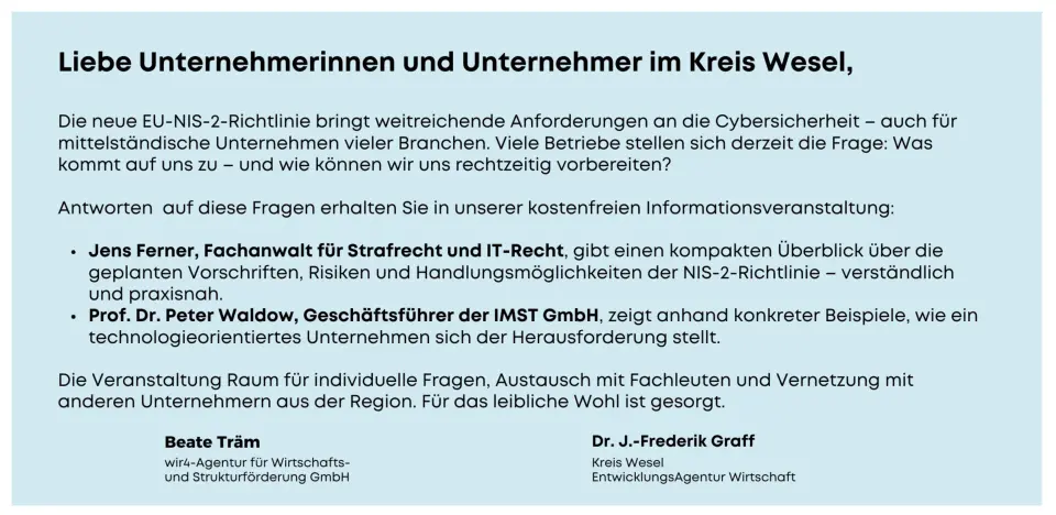wir4-Wirtschaftsförderung and Kreis Wesel EntwicklungsAgentur Wirtschaft (EAW) invite you to a practical information event on “NIS-2 regulations for companies” on Wednesday, April 30, 2025, from 09:30 to 12:00. The event will take place at IMST GmbH, Carl-Friedrich-Gauß-Straße 2, 47475 Kamp-Lintfort, Germany.