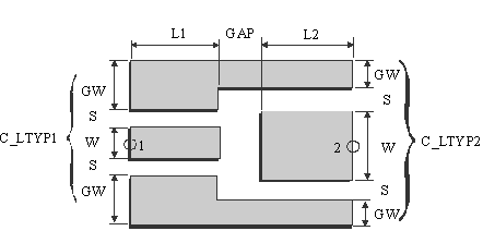 The C_GAP module represents a gap between the center conductors of two coplanar lines. The dimensions of lines connected to the gap are defined using data items addressed by C_ LTYP1 and C_TYP2. GAP is the spacing between the lines. L1 and L2 are the lengths of connected coplanar lines at ports.