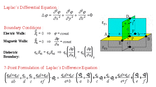 For the calculation of electric and magnetic potential distribution inside the shielded box, the Laplace´s differential equation is solved. A 7-point formulation is derived from Laplace´s difference equation using the corresponding boundary conditions. The possible boundaries are: electric walls, magnetic walls and dielectric boundary. The 7-point formulation expresses the electrical potential at any grid point P inside the box as a function of potentials at 6 neighboring points and their distances to the point P (Figure 2-4).
